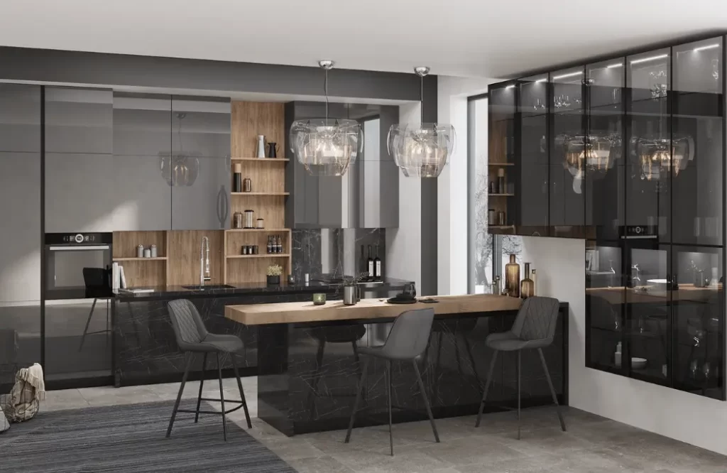 A dual-function design that combines crockery storage with wine racks, glass hangers, and bar counters.