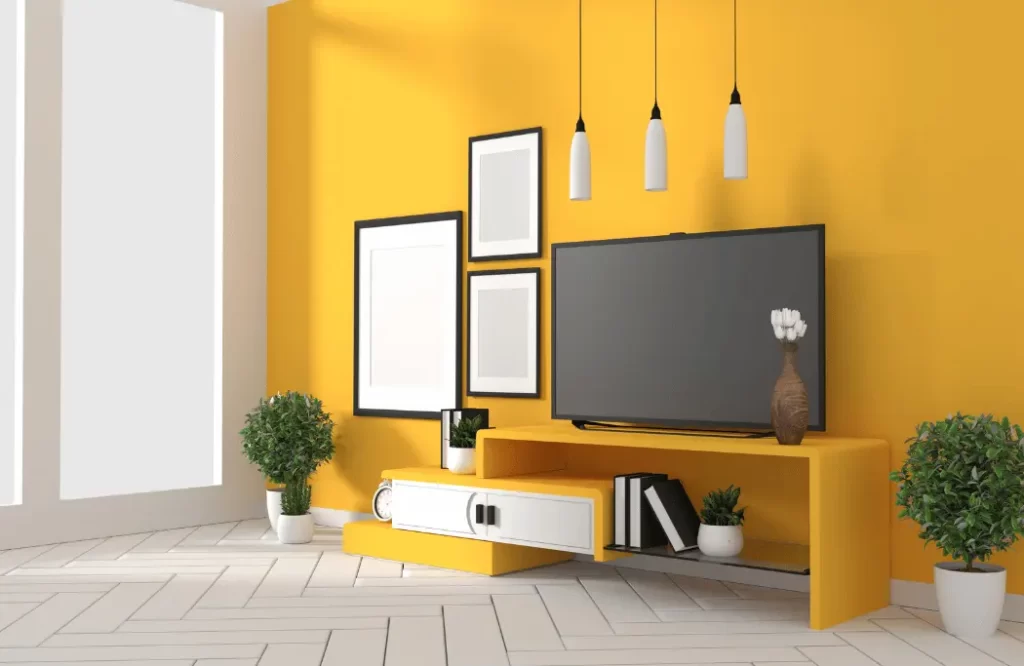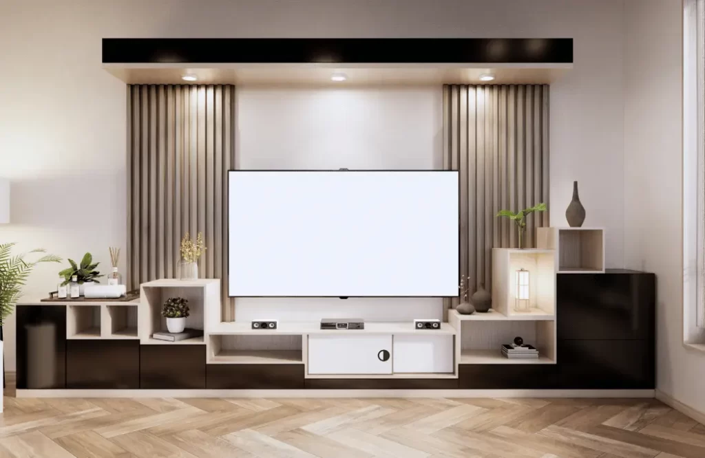 Choose a design that matches your living room’s theme, hides cables, offers storage, and complements your furniture. Homemate Interiors helps you choose the perfect custom design.